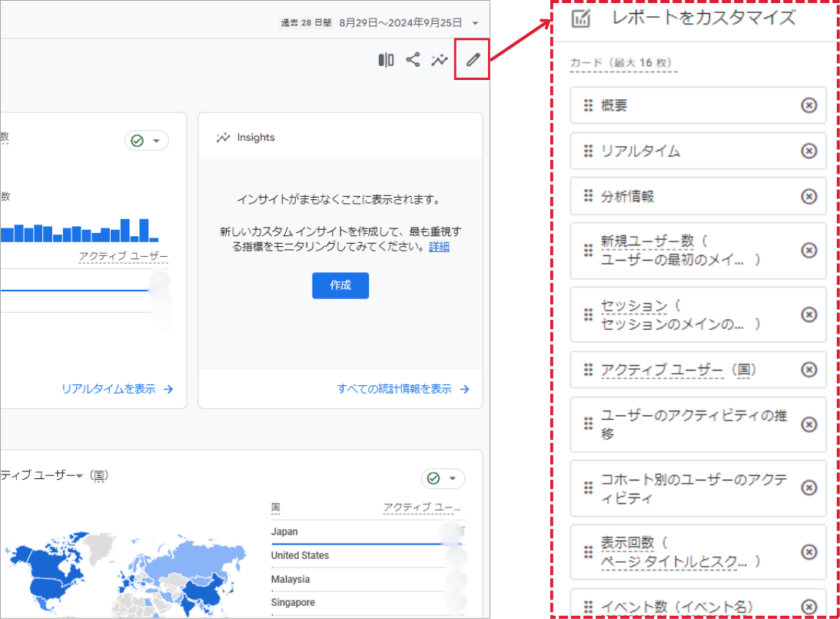 これらのレポート項目は画面右上からカスタマイズができます。しかし注意点もありますので確認しましょう。