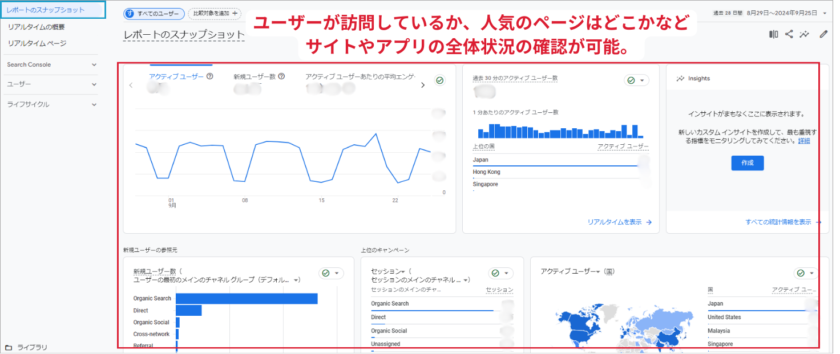 サイトやアプリの全体の概要を確認できます。毎日細かくGA4のデータを把握するのは不可能ですが、スナップショットで流入数の傾向や表示が多いページなど網羅的に確認することで「流入数がどこかで急に伸びた時」「新規ユーザーの参照元に変化が出た時」などに、いち早く気が付くことができます。まずGAを開いたとき確認することをおすすめします。