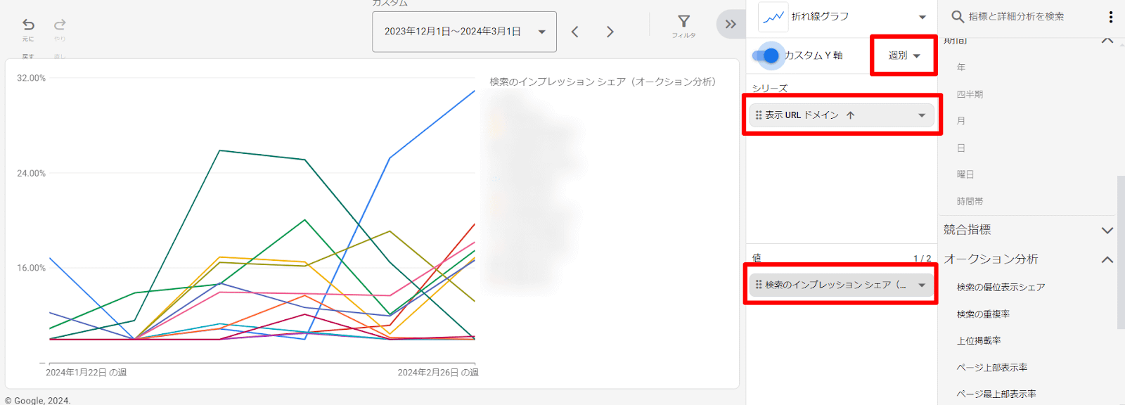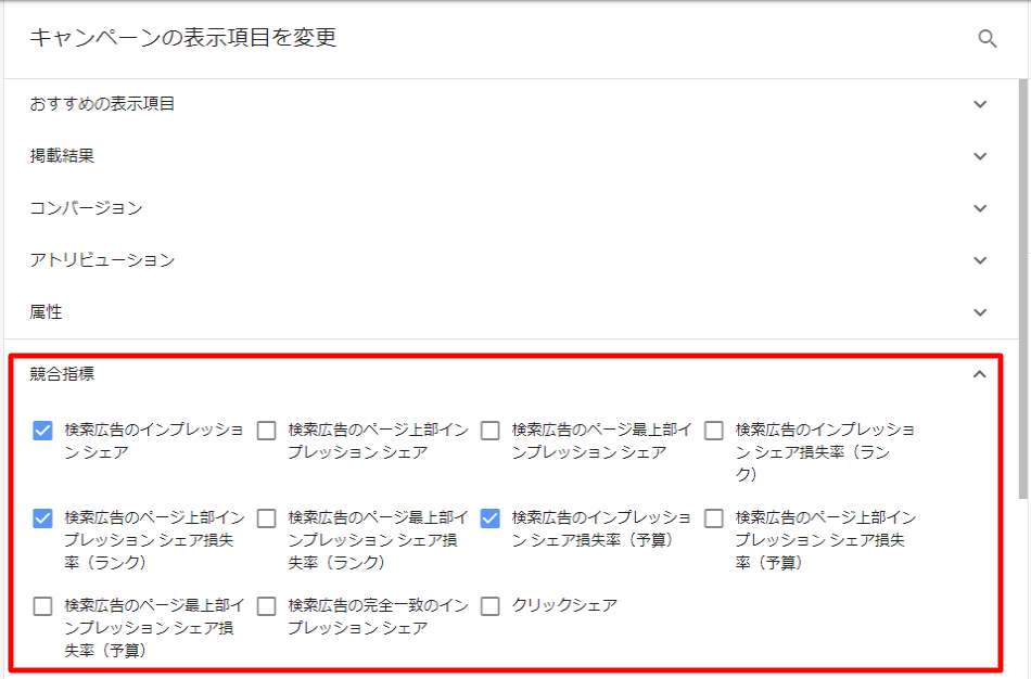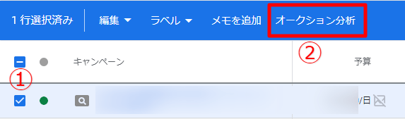 検索、ショッピング、または P-MAX のキャンペーンを組み合わせてオークション分析を確認した場合、選択が必要です。