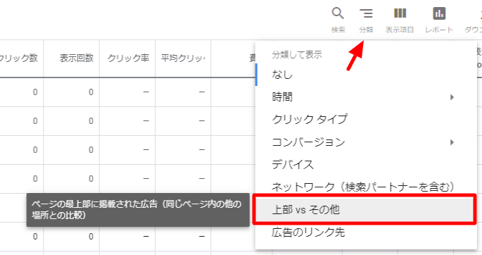 なお、上部とそれ以外とでは、キャンペーン一覧より[分類]>[上部 vs その他]からそれぞれの掲載結果を確認できます。