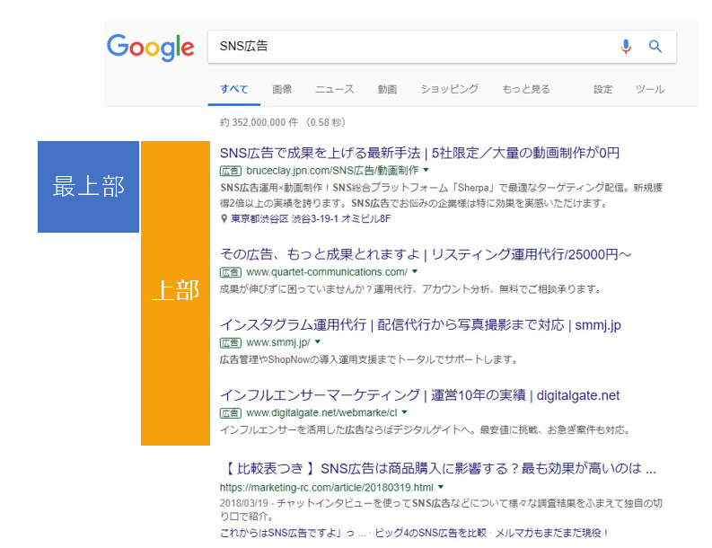 検索結果の上部に表示される広告は最大4件なのでその中のどこかに表示されていればページ上部への表示とみなされます。
