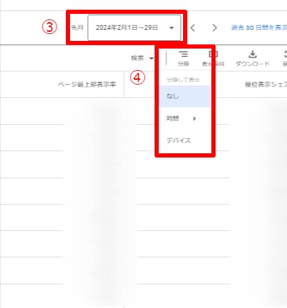 ④(任意)分類から分析したい期間やデバイスを設定