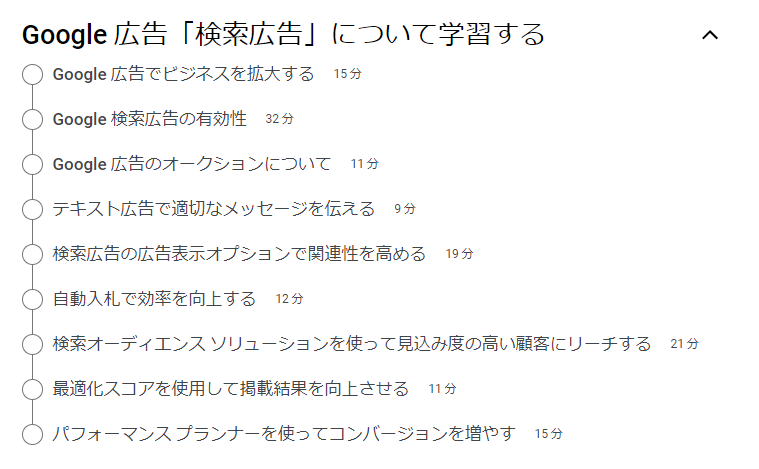 上図は、Google 広告「検索広告」の認定資格のe ラーニング コースです。