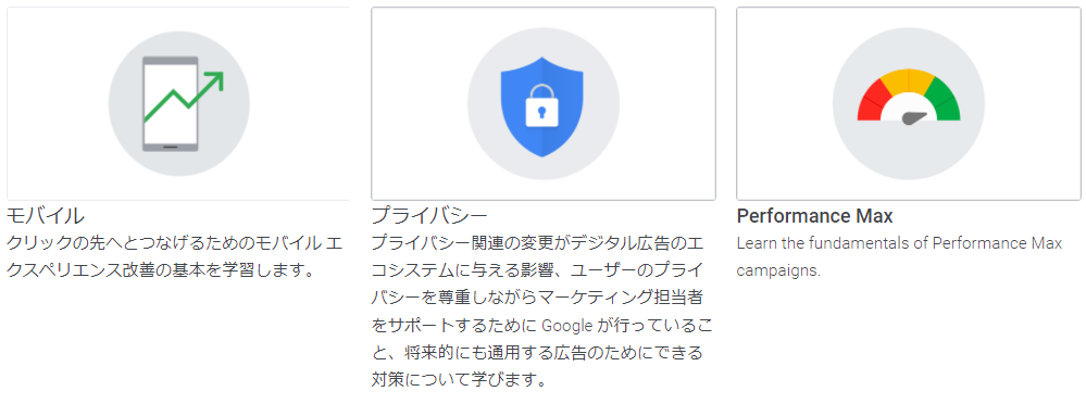 またスキルショップでは認定資格は無いですが、プライバシーに関する規制の学習やP-MAXの活用方法などを学ぶことも可能です。Cookieの規制などプライバシー保護が進んでいるなかでの対応策や、新しい配信手法を学ぶためにも、是非一度受講してみてはいかがでしょうか。