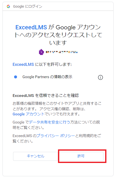 Goolge Partners の情報の表示を「許可」をクリックしてログイン完了です。
