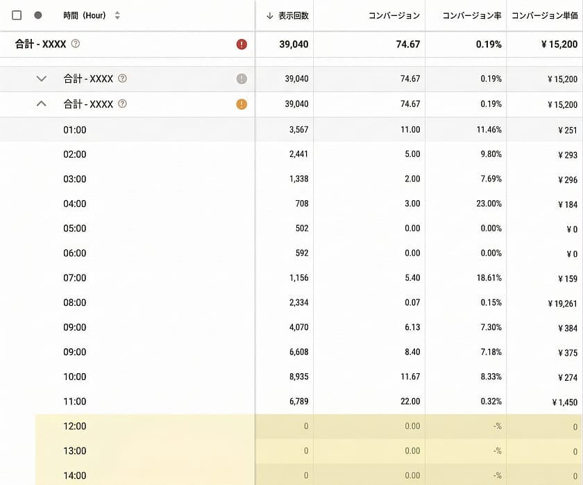上記がDSLがかかった状態の管理画面(イメージ)です。12時以降に表示回数が0になっているのは、12時台に「1日の費用上限」に到達してしまったため。キャンペーンの1日の予算にも達しておらず、広告スケジュールも設定していないのに、特定の時間以降すべての配信が止まった場合は、DSLを疑ってみてください。