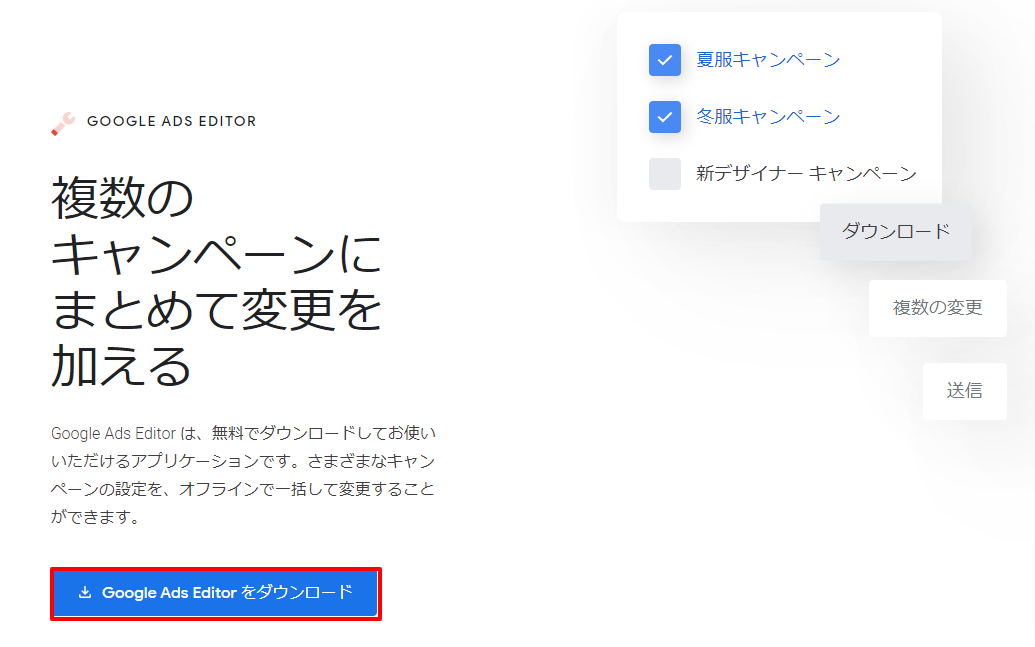 Google 広告エディタとは、Google 広告の変更が行える無料のアプリケーションです。
