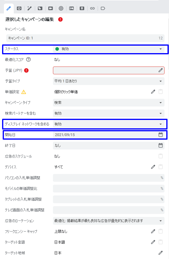 基本的にはGoogle 広告の管理画面と設定項目は同じですが、青枠で囲んだ部分は注意が必要です。