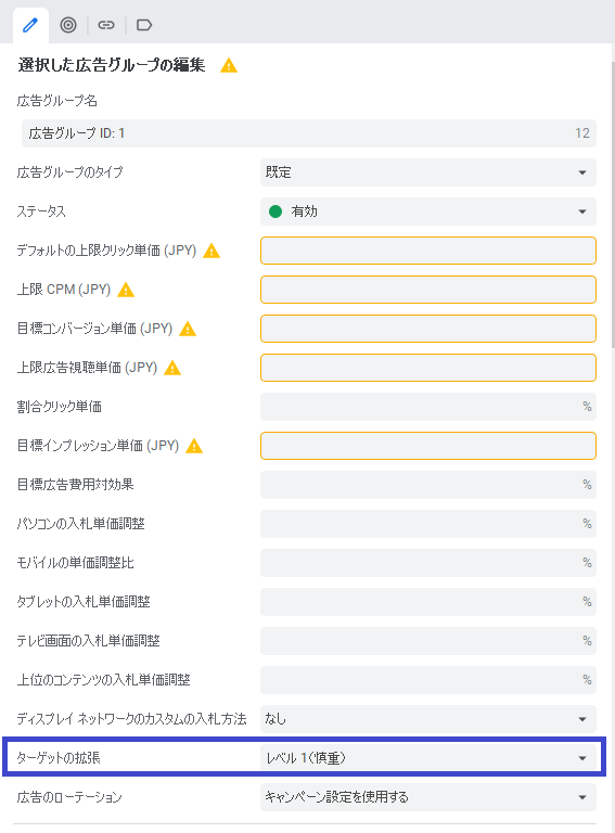 検索広告のみの場合は問題ありませんが、ディスプレイ広告やファインド広告など、ターゲットの拡張に対応しているキャンペーンの場合、「無効」以外に設定されていると、ターゲティングで設定したオーディエンス以外のユーザーにも配信されてしまいます。