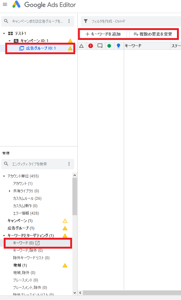 ツリービューから対象の広告グループが選択されていることを確認し、タイプリストの 「キーワードとターゲティング」から「キーワード」、「キーワードを追加」か「複数の要素を変更」を選択します。