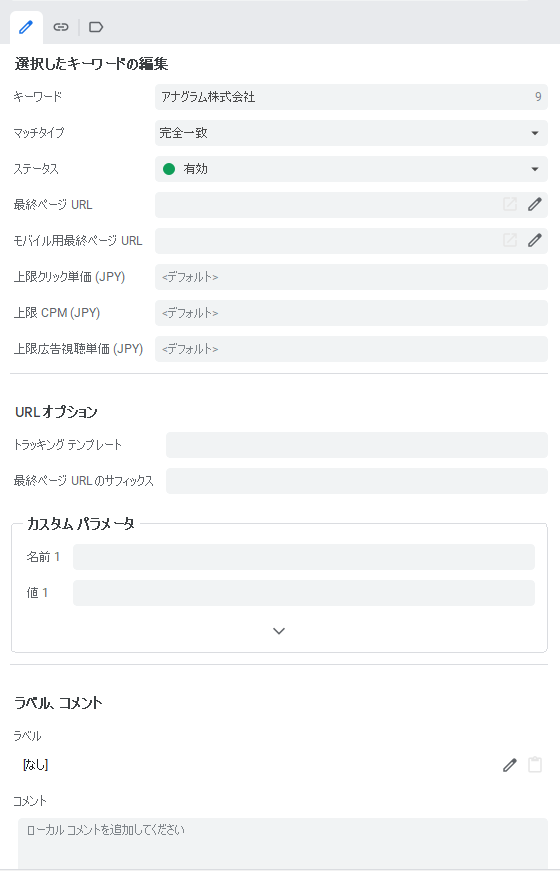 編集パネルでキーワードの設定項目を編集します。