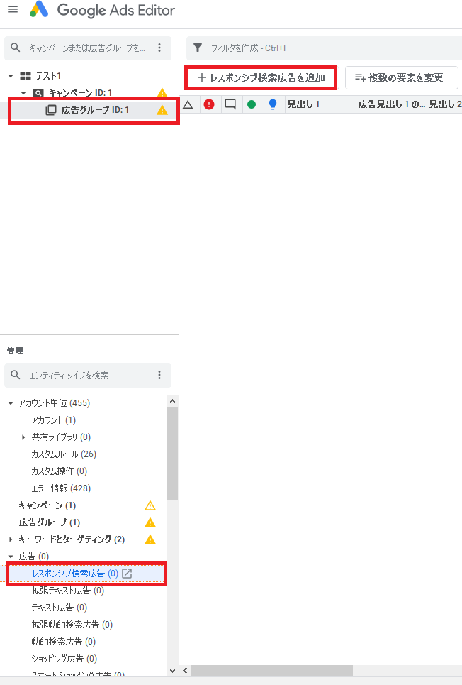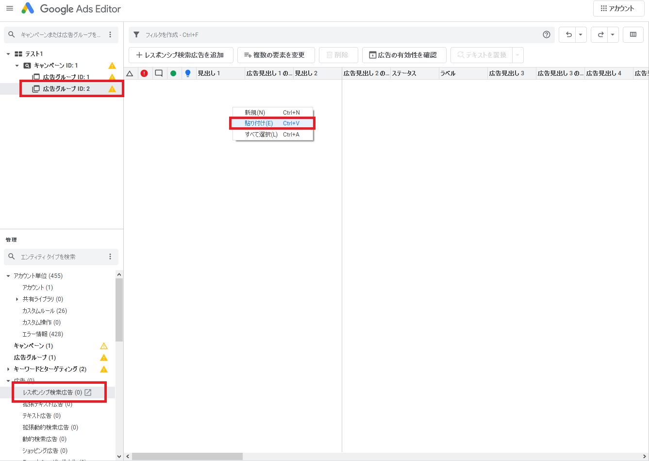ツリービューから貼り付け先の広告グループを選択し、タイプリストの「広告」から「レスポンシブ検索広告」をクリックし、「Ctrl+V」(Macの場合は「command +V」)もしくはデータパネル上で右クリックして「貼り付け(V)」を選択します。