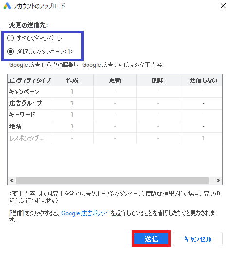 1つのキャンペーンのみ編集した場合は、「選択したキャンペーン」で問題ありませんが、複数のキャンペーンを編集した場合は選択したキャンペーン以外の変更が広告管理画面に反映されないため、忘れずに「すべてのキャンペーン」を選択しましょう。