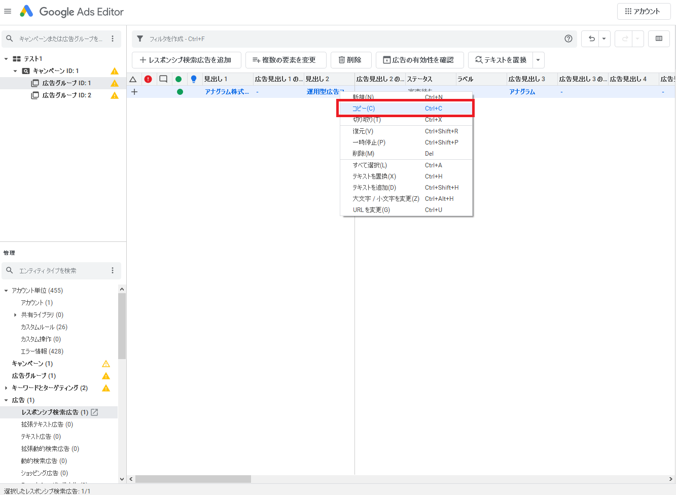 コピー元のレスポンシブ検索広告を選択し、「Ctrl+C」(Macの場合は「command +C」)もしくは右クリックして「コピー(C)」を選択します。