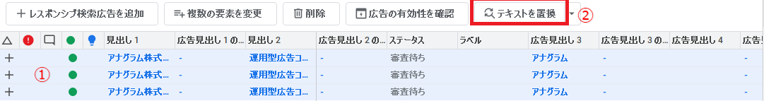 ①テキストの置換対象の広告を選択し、②「テキストを置換」を選択します。