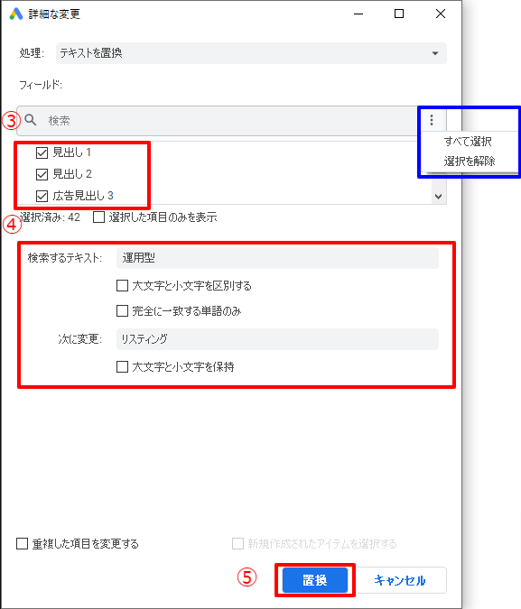 ④検索するテキストと、置換後のテキストを入力します。ここでは「運用型」というテキストを「リスティング」に置換するという例を示しています。