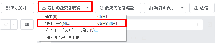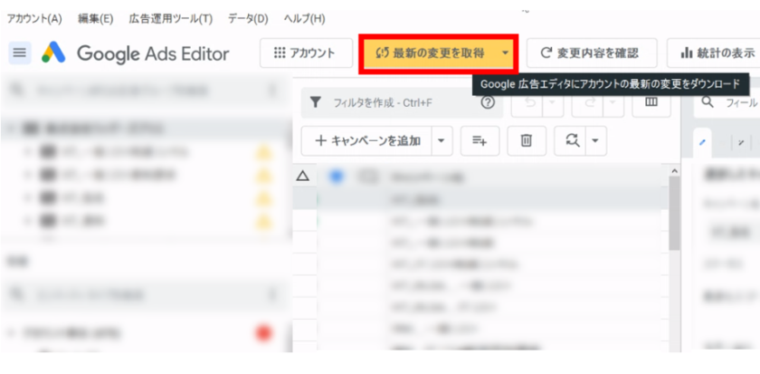 Google 広告エディタを使用する際の注意点として、作業の前に必ず「最新の変更を取得」し、広告管理画面とGoogle 広告エディタが同じ内容になっている状態にしましょう。