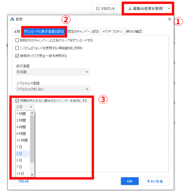 ①最新の変更を取得>同期リマインダーを変更