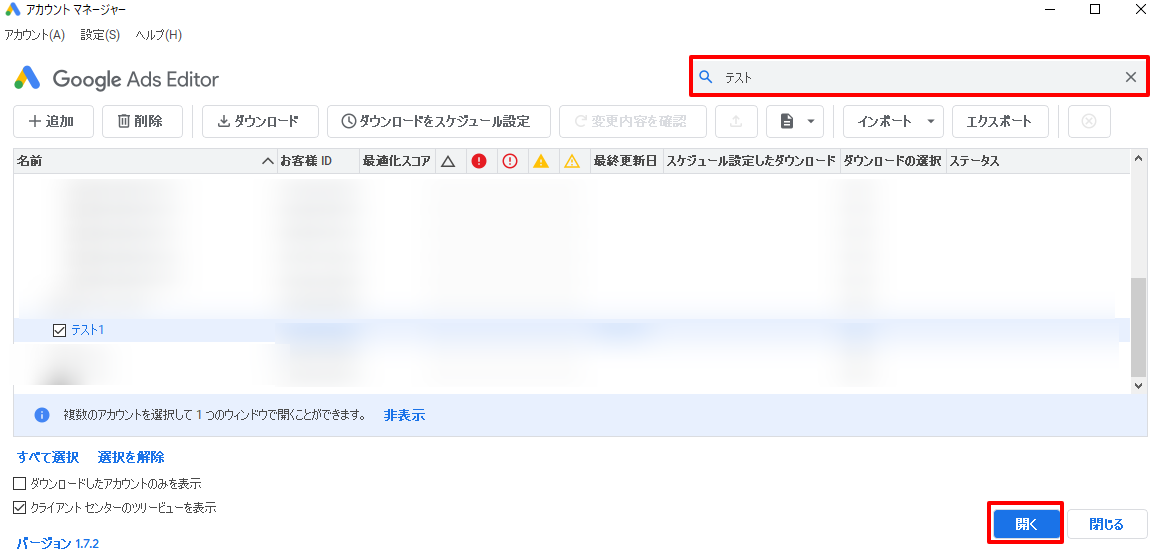 右上の検索ボックスからダウンロードしたいアカウントを検索し、チェックボックスにチェックを入れて「開く」を選択します。