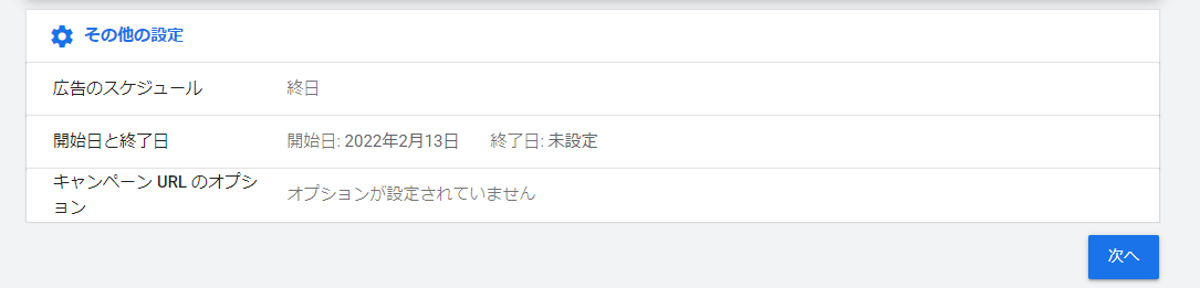 特定の曜日や時間帯のみ広告を配信したい場合、開始日・終了日を指定したい場合は設定しましょう。また、トラッキングURLなどのURLオプションを設定したい場合も、こちらで設定可能です。