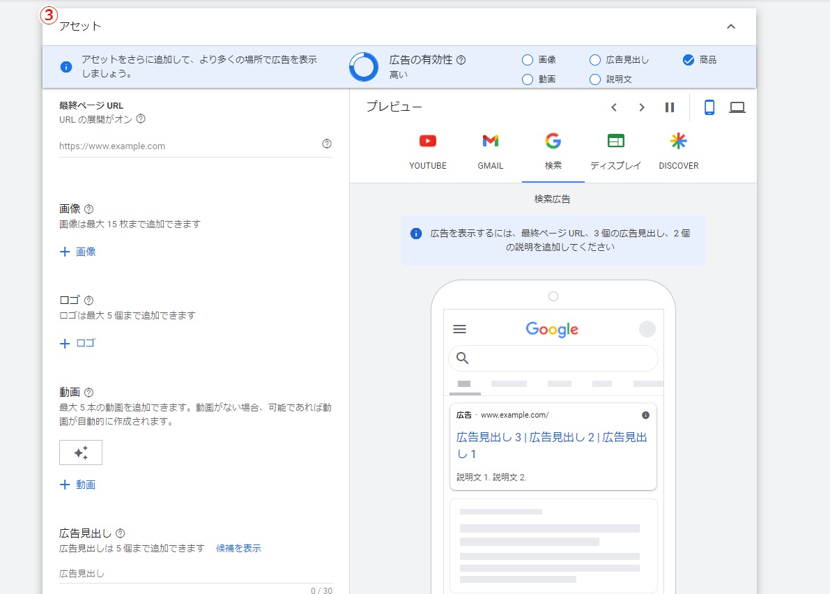 機械学習を促進し広告成果を高めるため、可能な限り多様なアセットを追加すること、またアセットのパターンも複数種類を設定することが推奨されています。また広告枠によって、最低限必要なアセットの種類と数が規定されています。