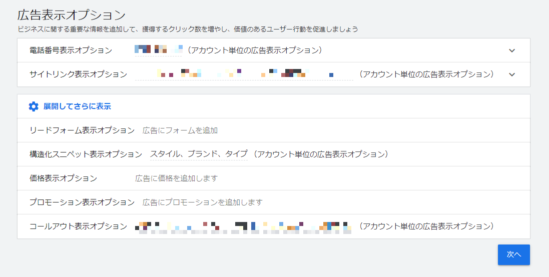 自社のビジネス情報をより詳しく伝えることで広告成果の向上が見込めるため、可能な限り設定することをおすすめします。P-MAXキャンペーンで設定できる広告表示オプションは以下です。