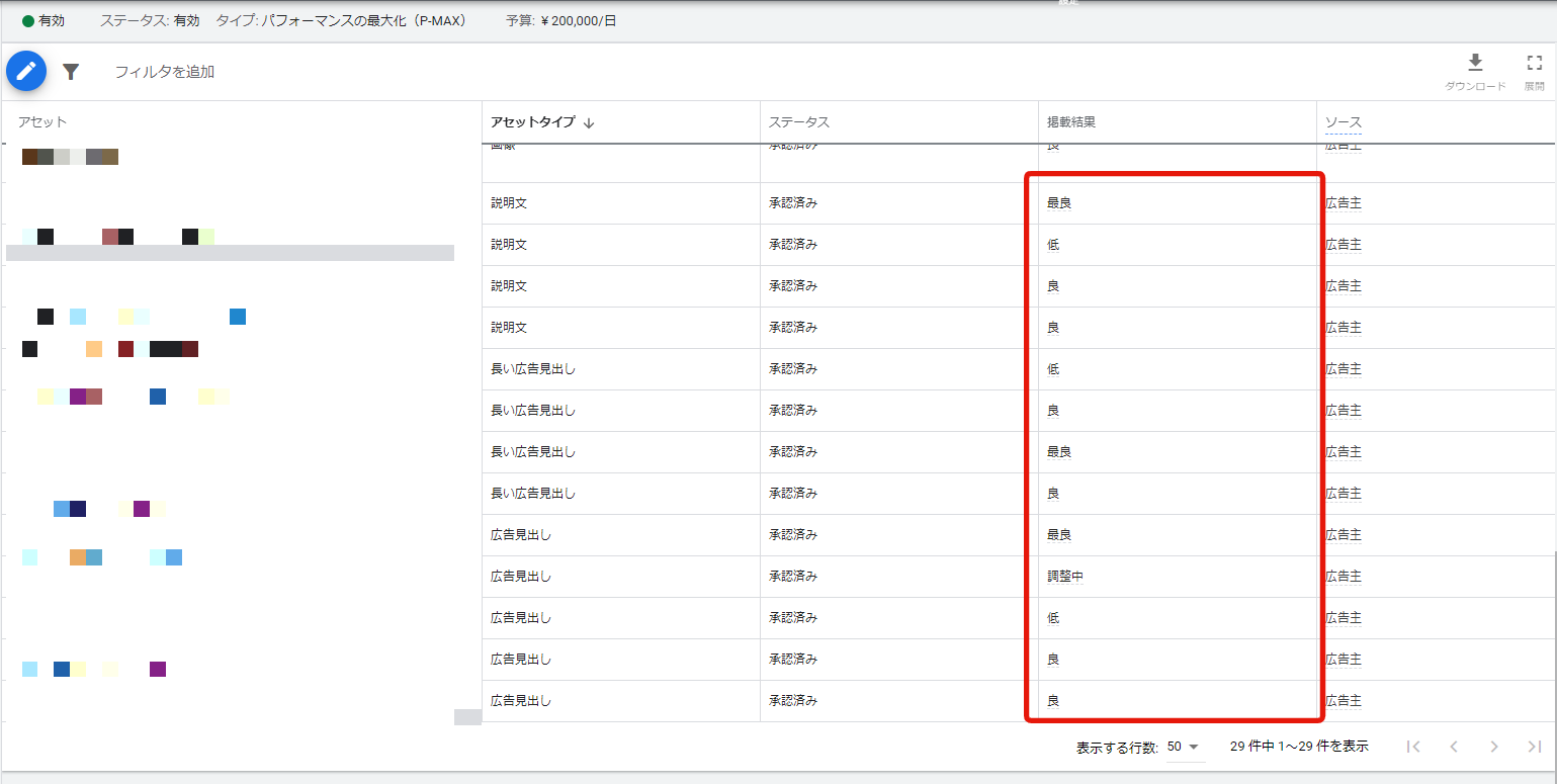 アセット毎の掲載結果は基本的に「最良」「良」の評価のものに集約され、「低」評価のアセットの表示回数は少なくなります。そのため、各アセットの中で「低」と評価されたアセットは適宜入れ替えていくとよいでしょう。