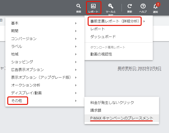 管理画面上部の「レポート」>「事前定義レポート」>「その他」>「P-MAXキャンペーンのプレースメント」を選択することで閲覧できます。事前定義レポートではなく、レポート機能から自身で項目を選択することでも可能です。