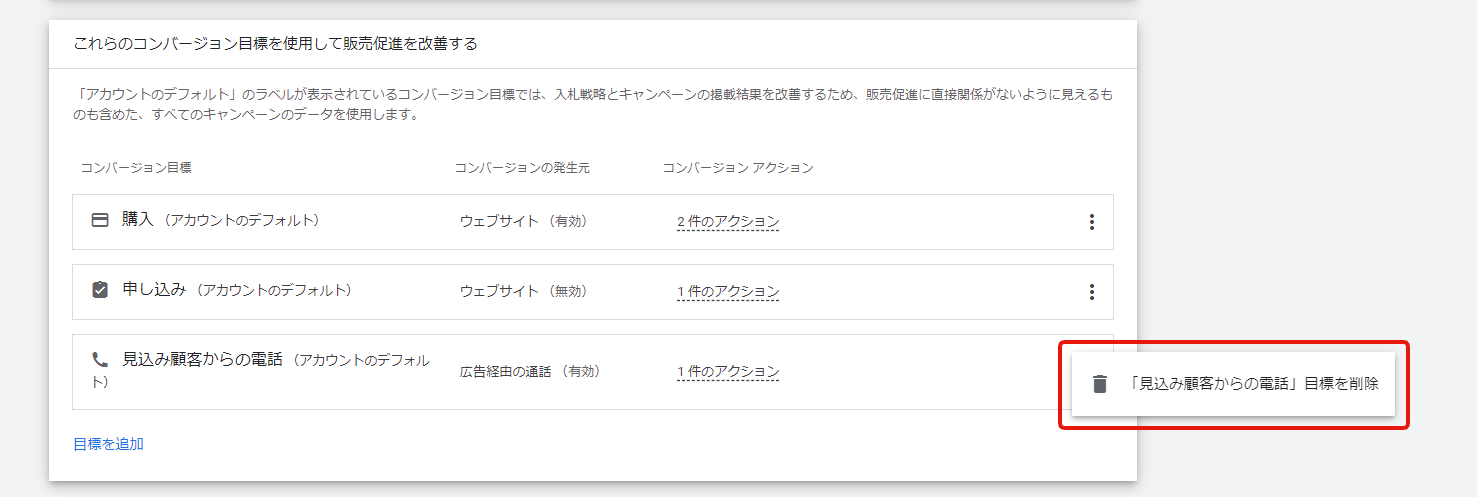 その次にコンバージョン目標を設定します。デフォルトではアカウントで設定されるコンバージョンが全て含まれているので、もし目標に含めたくない項目があれば適宜削除しましょう。画面右側の3点リーダーをクリックすることで削除のオプションが表示されます。