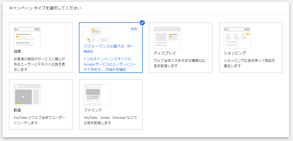 次にキャンペーンタイプの選択画面で「パフォーマンスの最大化(P-MAX)」を選択します。