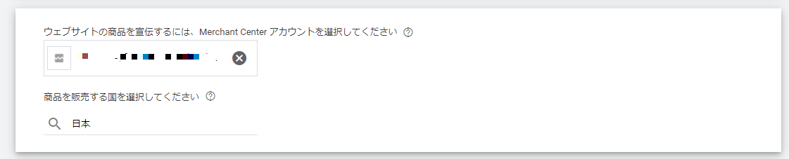 Google 広告アカウントとGoogle Merchant Centerと連携している場合は、次にMerchant Centerアカウントを選択する画面が出てきます。P-MAXキャンペーンで商品の広告を配信したい場合は対象のアカウントを選択し、商品を販売する国を指定します。