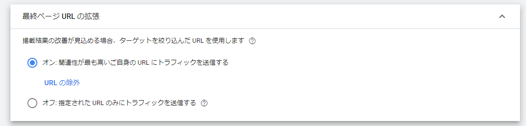 デフォルトでは「最終ページURLの拡張」がオンになっています。こちらをオンにすると、Googleがコンバージョン獲得が見込めると判断した場合、設定したリンク先URL以外の同一ドメインURLにも広告が配信される可能性があります。