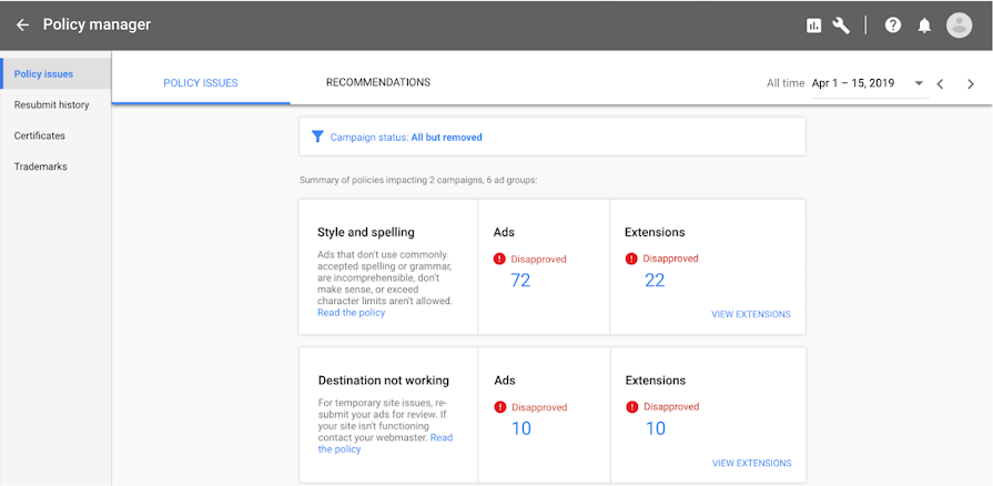 Googleは、アカウント内で発生している審査の不承認や制限付きステータスの発生状況が把握できるポリシーマネージャの導入など、ポリシーにまつわる機能のアップデートを行うことを2019年3月14日に発表しました。