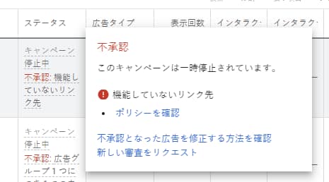 2018年より、広告が不承認や制限付きステータスとなった場合、ステータスの項目をマウスオーバーしてみるとキャプチャのようなバルーンが表示されますが、この機能を2019年も継続して拡張していく予定であると発表されています。