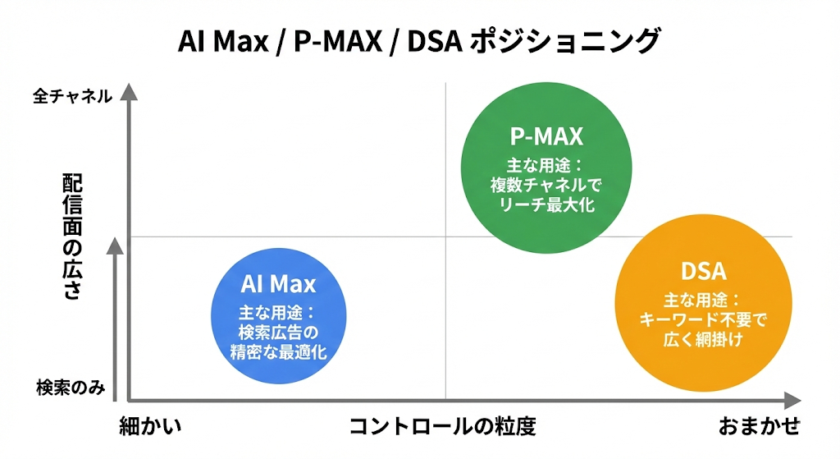 実際には、DSAとAI Maxを併用することも可能です。DSAで大きく網を張りながら、重要な商品カテゴリーではAI Max搭載の検索キャンペーンで精密にコントロールするといったアプローチも有効です。
