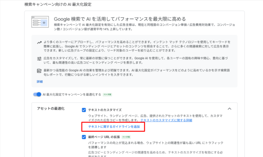 - 最終ページURLの拡張:成果向上が見込まれる場合に、自社サイト内の最も関連性の高いページへユーザーを自動的に誘導する機能です。ただし、テキストのカスタマイズがオンになっている必要があり、広告文とランディングページの内容を一致させるための条件となっています。