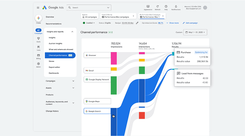 このレポートでは初めて、P-MAXキャンペーン内でのトラフィックやコンバージョンがどのチャネル(検索、YouTube、Discoverなど)から来たかを可視化できます。グラフや図表によって理解をサポートする機能も追加されます。