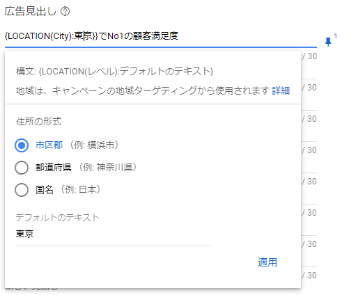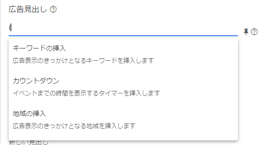 ユーザーの所在地や関心のある地域に合わせて、レスポンシブ検索広告の広告文に該当する地域名を挿入できる機能です。商品やサービスを提供している地域を広告文でアピール可能です。店舗などサービスを利用できる地域が限られる場合に有効ですね。