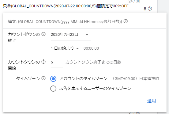 広告を表示するユーザーのタイムゾーンで利用する場合には「{COUNTDOWN()}」を対応箇所に入力します。もし、アカウントのタイムゾーンで利用する場合には、「{GLOBAL_COUNTDOWN()}です。