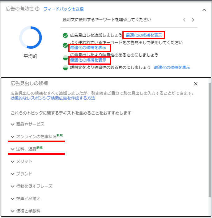 広告見出しの候補に様々なトピックが表示され、テキストの提案が行われます。赤線部箇所が今回追加された箇所になっており、オンラインでの購入に対してユーザーに安心して購入してもらえるようなものを見出し文として提案しています。レスポンシブ検索広告の見出し文に迷ったときはこちらを確認して、新しい見出し文を考えてみるとよいでしょう。