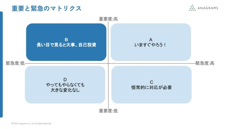 アナグラムにおけるグロースハックの取り組みは、重要度と緊急度のマトリクスで考えると「緊急度は高くないが重要なこと」です。