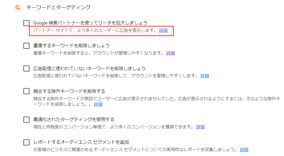 | キーワードとターゲティング | Google 検索パートナーを使ってリーチを拡大しましょう | |