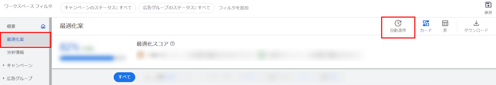 管理画面の左側のメニューで[最適化案] をクリック後、画面右上の [自動適用]をクリックします。