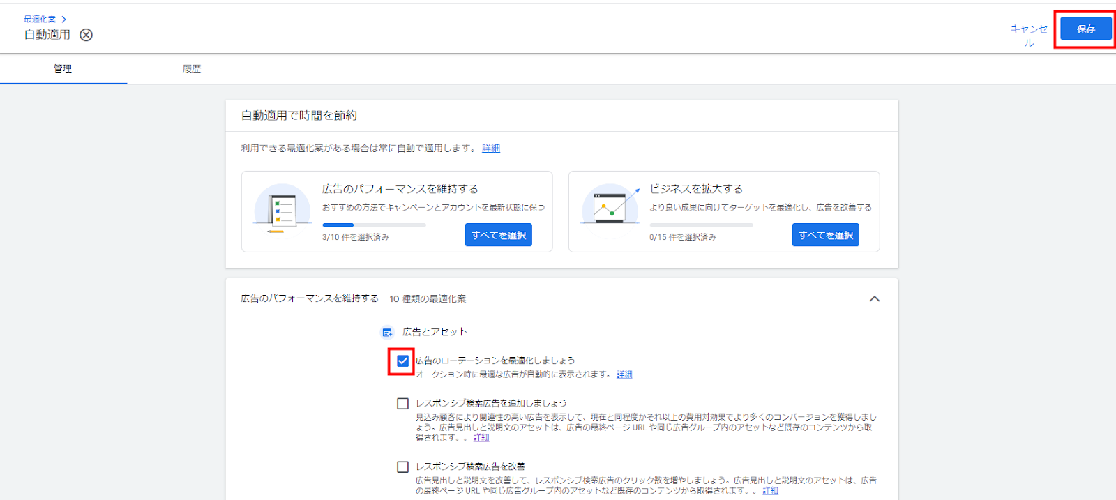 自動適用したい最適化案にチェックを入れて[保存]をクリックで自動適用の設定完了です。