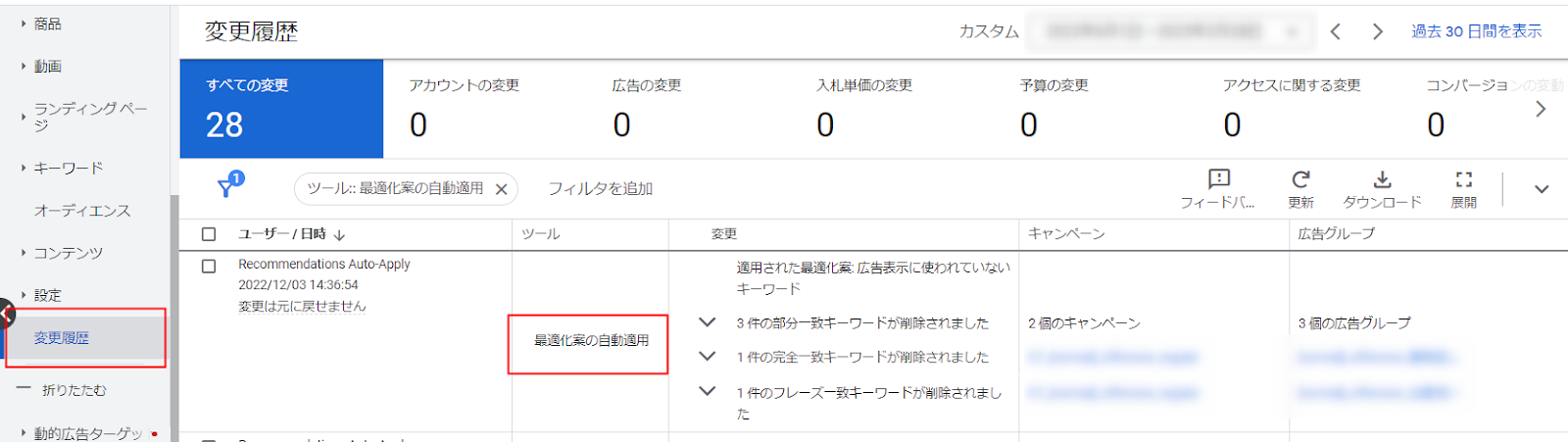 キャンペーンの変更履歴は、管理画面の左側のメニューより[変更履歴]をクリックで表示できます。最適化案の自動適用の履歴のみを見たい場合は、フィルターをかけます。