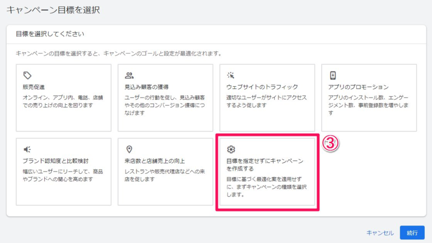 「目標を指定せずにキャンペーンを作成する」を選択します。