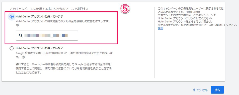 持っていれば、Hotel Centerアカウントの接続します。持っていなければ、パートナー事業者がGoogleへ提供している料金の情報が広告に使用されます。