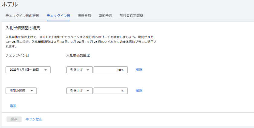 ホテル広告はチェックインの曜日やチェックイン日、滞在日数に応じて入札単価を調整できます。
