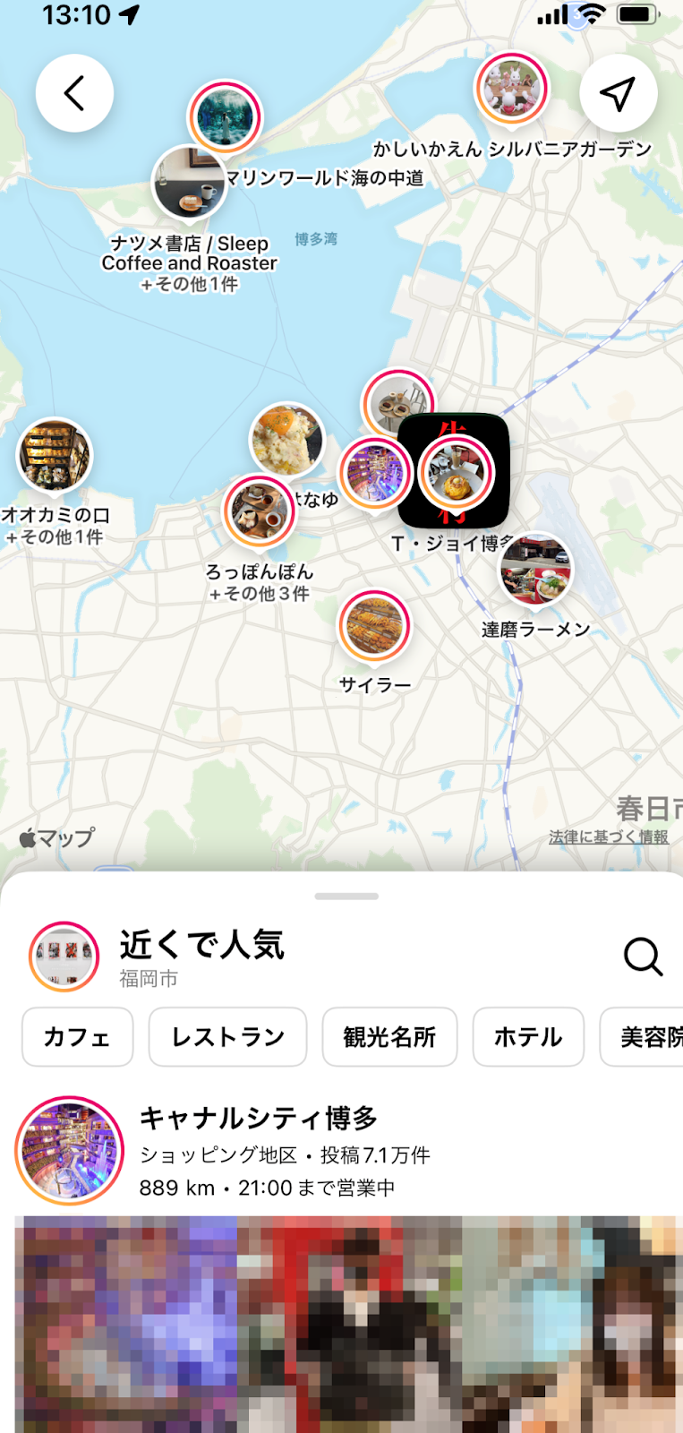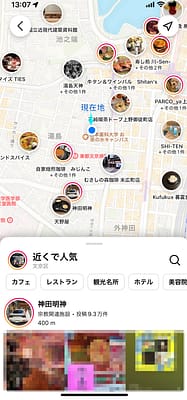 位置情報の使用をInstagramに許可することで、現在地と近い場所情報が紐づいている投稿をマップ上で見ることができます。