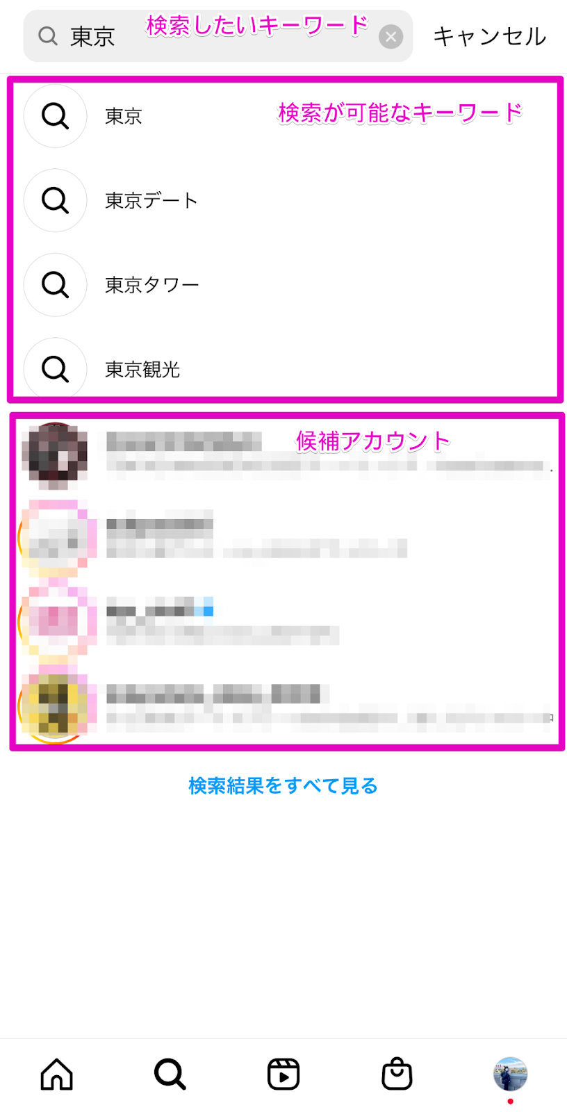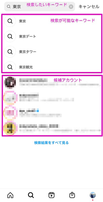 検索結果にはユーザーが入力した検索語句をもとに検索が可能なキーワードとアカウントが表示されます。また、「検索結果をすべて見る」をタップすると検索結果上部に出現するアイコンから、アカウント、音源、ハッシュタグ、場所それぞれの結果がチェックできます。